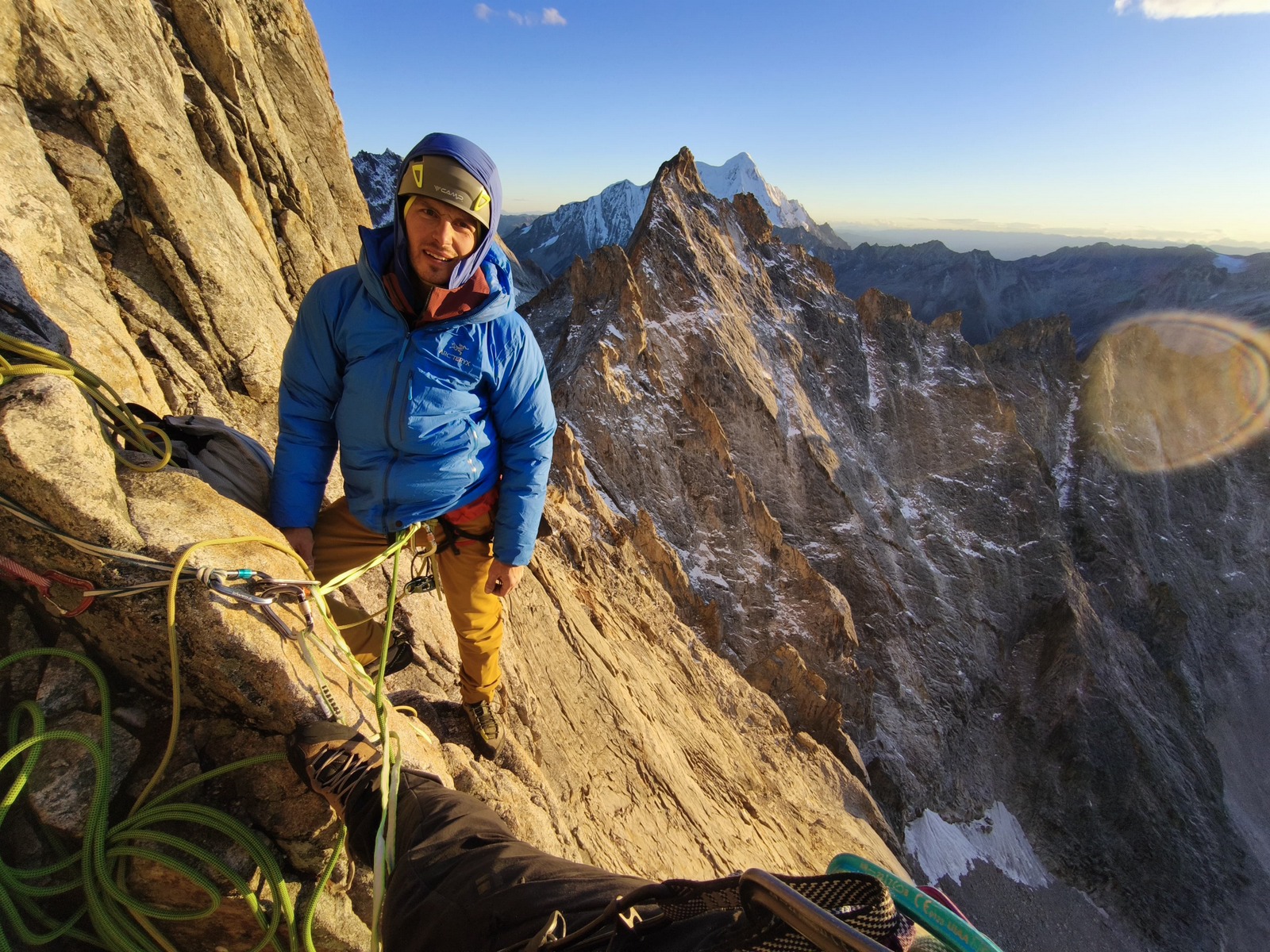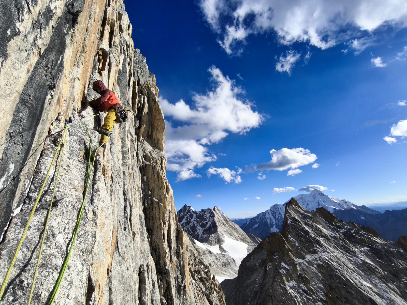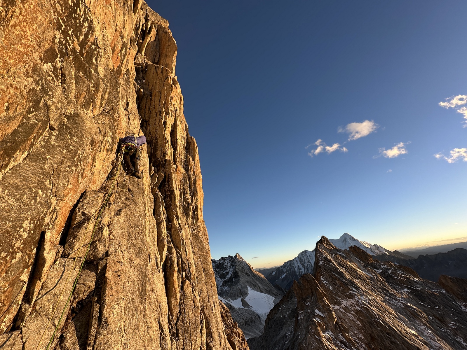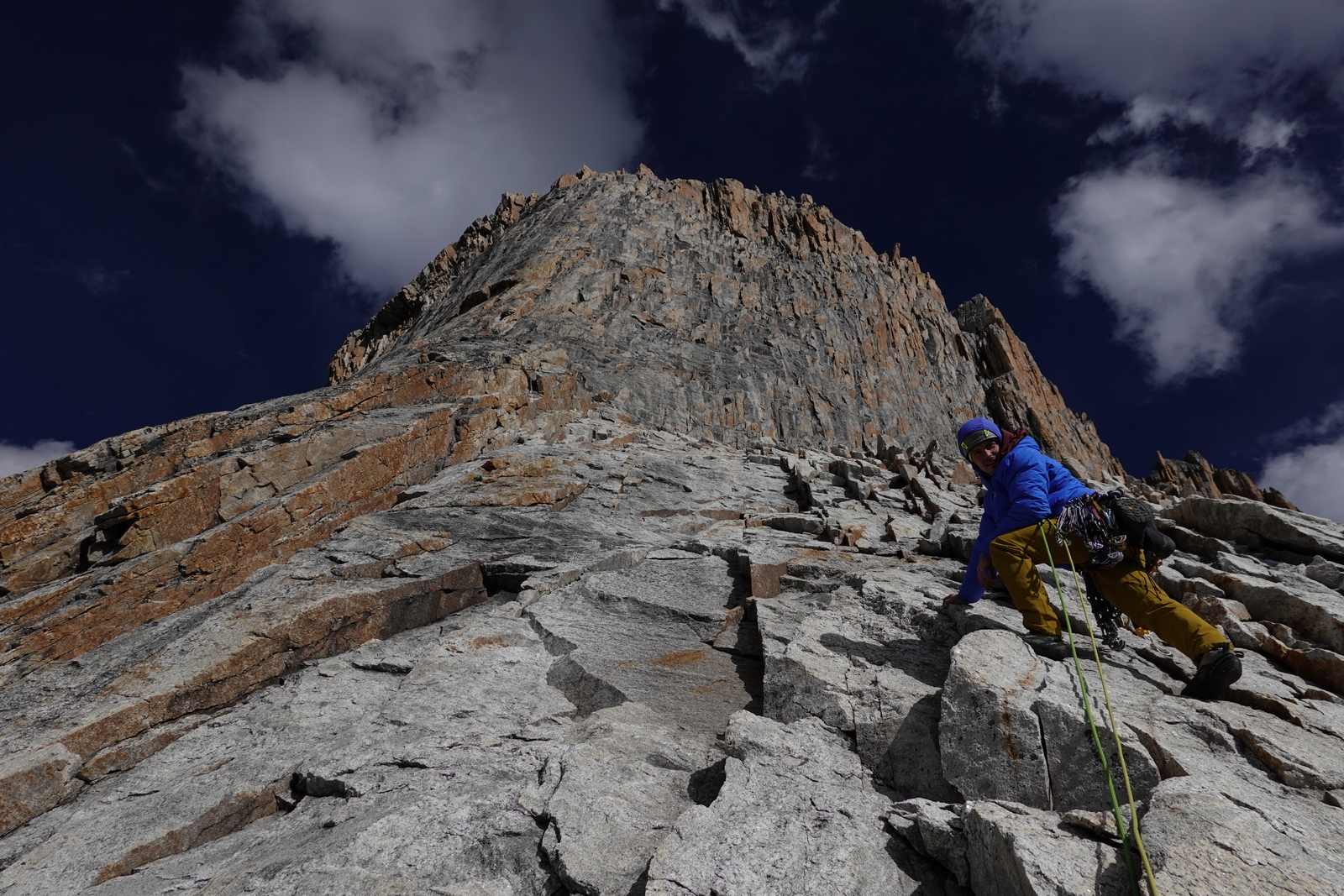 Za naslednji cilj sva najprej dostopila bližje stene, ki sva jo želela preplezati in tam prespala, za lažji in hitrejši začetek plezanja. Težko je bilo oceniti, kako hitro bova lahko plezala v ogledani liniji, zato sva se odločila, da s sabo vzameva minimalno opremo za bivak. Mraz in pozen prihod sonca v to zahodno steno je precej začinilo plezanje. Kljub neekstremnim težavam je bilo plezanje precej delikatno zaradi mestoma posnežene skale. Vseeno sva napredovala dokaj hitro in se posledično odločila, da po približno ocenjeni polovici preplezane stene “deponirava” opremo za bivak. Lažja sva še hitreje napredovala, dokler se ob zadnji svetlobi dneva ni malo zakompliciralo tik pod vrhom v strmi steni brez pravih poči za varovanje. Prihod noči naju je prisilil v kreativno iskanje prehodov, en diagonalni spust po vrvi in nekaj tehničnega plezanja. Na okoli 5600 m visokem vrhu sva bila zadovoljna, da je bila improvizacija uspešna in nama ni bilo treba obrniti tik pod vrhom. Sestop s spusti po vrvi je terjal precej zbranosti pozno v noč. Deponirano bivak opremo sva dosegla okoli treh zjutraj in se utrujena zavila v eno spalno vrečo ter pričakala jutro. Po špartanskem zajtrku sva sestopila vse do baznega tabora. Poleg dobrega plezanja v divjem okolju je bila tura v znamenju številnih kristalov, ki sva jih našla pod in v steni. Od tod ime najine prvenstvene smeri Grad kristalov. Kratko poslabšanje vremena je bilo kot naročeno za počitek in ogled naslednjega cilja. Žal si je Fanny na tej ogledni turi zvila gleženj in po dveh dneh opazovanja otekline in premlevanju smiselnega nadaljevanja, sva se odločila, da končava hribovsko aktivnost in se za nekaj časa prestaviva v Liming - Kitajski prestolnico tradicionalnega plezanja.