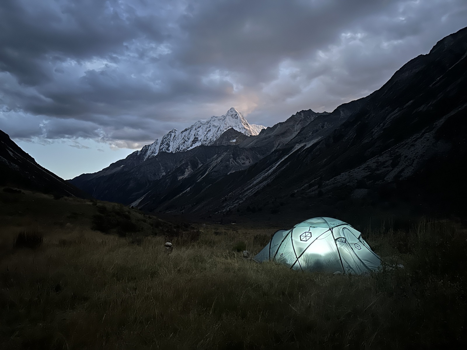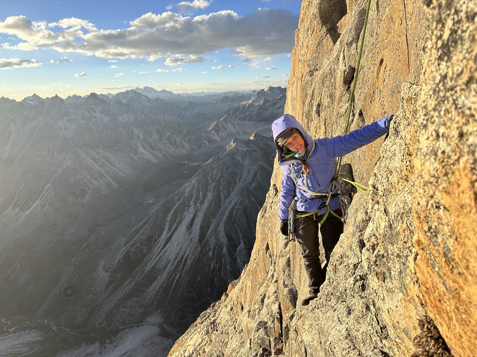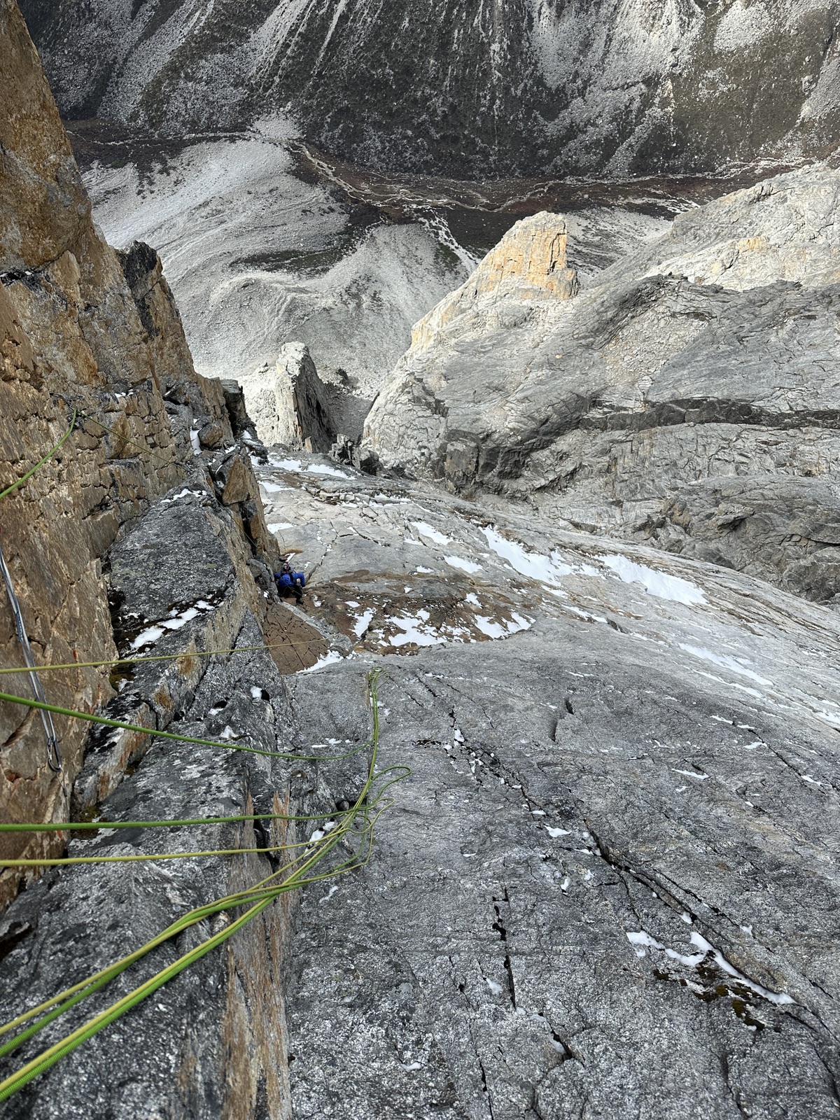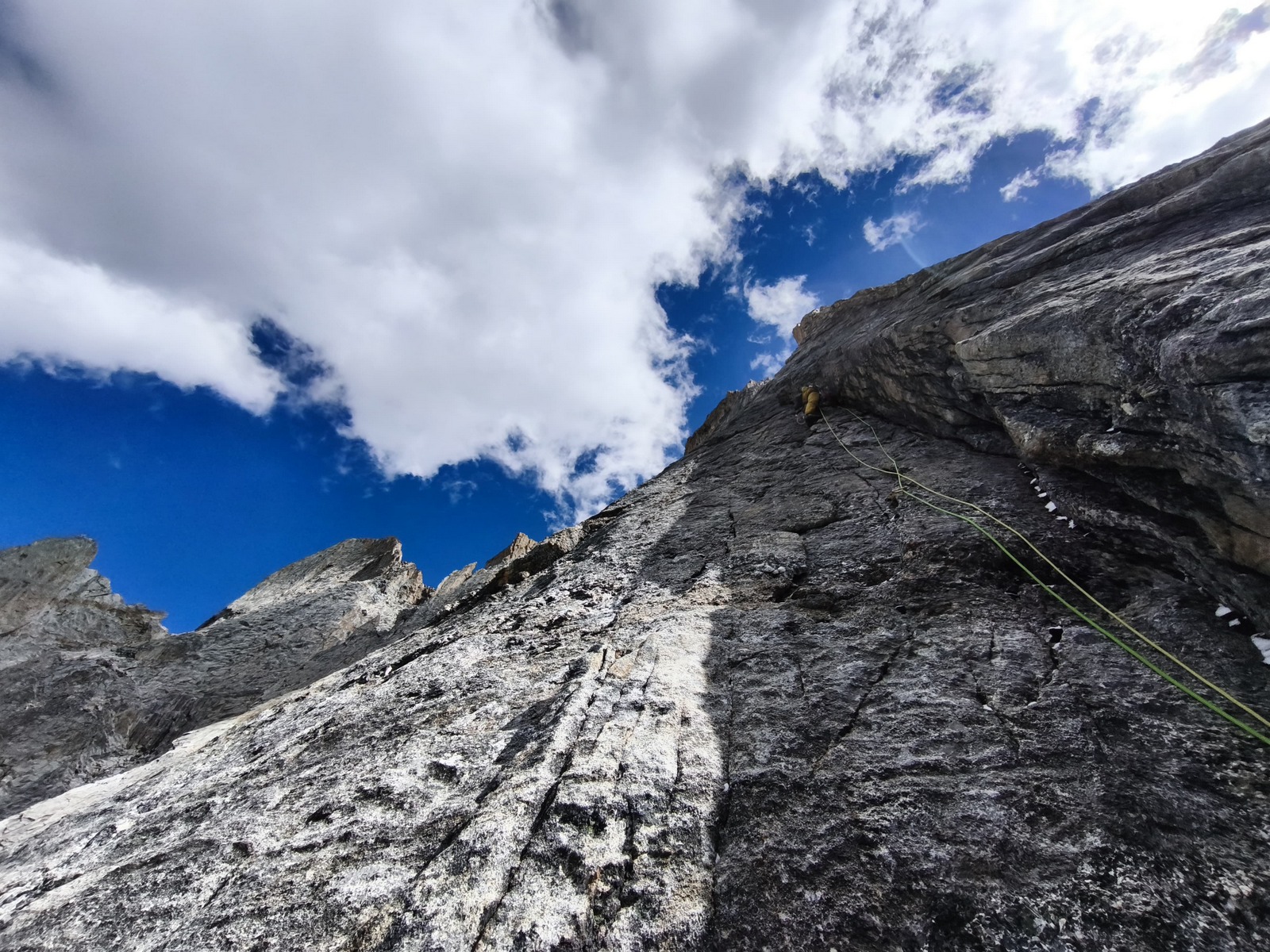 Za naslednji cilj sva najprej dostopila bližje stene, ki sva jo želela preplezati in tam prespala, za lažji in hitrejši začetek plezanja. Težko je bilo oceniti, kako hitro bova lahko plezala v ogledani liniji, zato sva se odločila, da s sabo vzameva minimalno opremo za bivak. Mraz in pozen prihod sonca v to zahodno steno je precej začinilo plezanje. Kljub neekstremnim težavam je bilo plezanje precej delikatno zaradi mestoma posnežene skale. Vseeno sva napredovala dokaj hitro in se posledično odločila, da po približno ocenjeni polovici preplezane stene “deponirava” opremo za bivak. Lažja sva še hitreje napredovala, dokler se ob zadnji svetlobi dneva ni malo zakompliciralo tik pod vrhom v strmi steni brez pravih poči za varovanje. Prihod noči naju je prisilil v kreativno iskanje prehodov, en diagonalni spust po vrvi in nekaj tehničnega plezanja. Na okoli 5600 m visokem vrhu sva bila zadovoljna, da je bila improvizacija uspešna in nama ni bilo treba obrniti tik pod vrhom. Sestop s spusti po vrvi je terjal precej zbranosti pozno v noč. Deponirano bivak opremo sva dosegla okoli treh zjutraj in se utrujena zavila v eno spalno vrečo ter pričakala jutro. Po špartanskem zajtrku sva sestopila vse do baznega tabora. Poleg dobrega plezanja v divjem okolju je bila tura v znamenju številnih kristalov, ki sva jih našla pod in v steni. Od tod ime najine prvenstvene smeri Grad kristalov. Kratko poslabšanje vremena je bilo kot naročeno za počitek in ogled naslednjega cilja. Žal si je Fanny na tej ogledni turi zvila gleženj in po dveh dneh opazovanja otekline in premlevanju smiselnega nadaljevanja, sva se odločila, da končava hribovsko aktivnost in se za nekaj časa prestaviva v Liming - Kitajski prestolnico tradicionalnega plezanja.