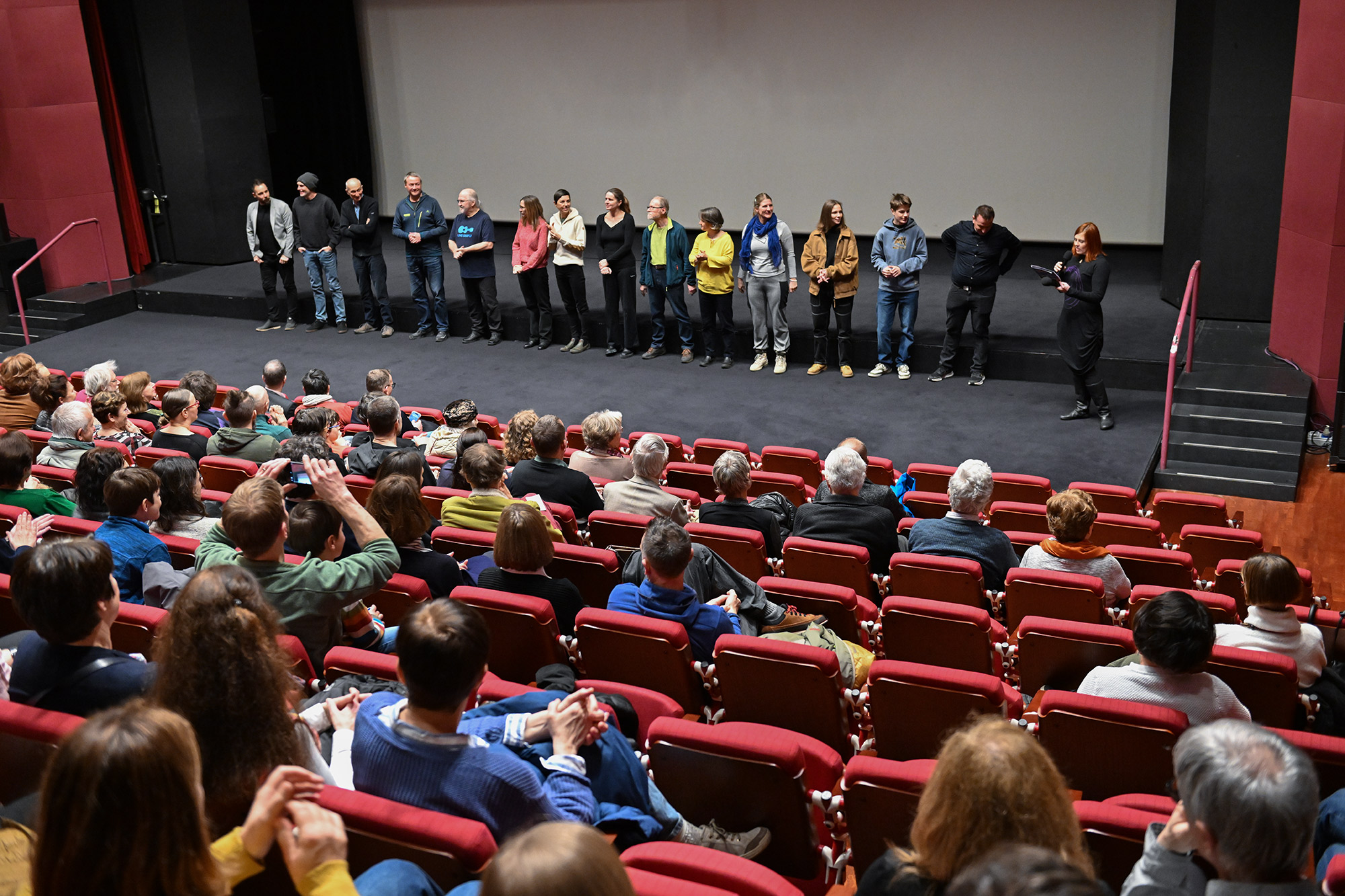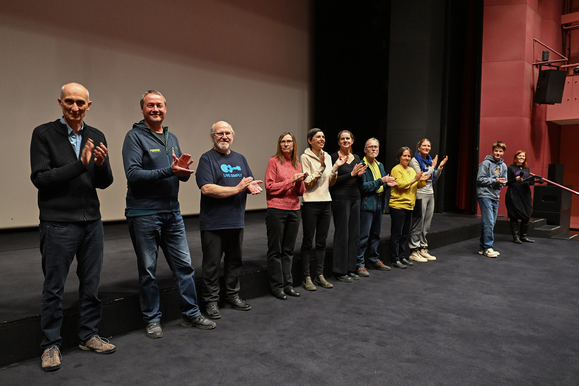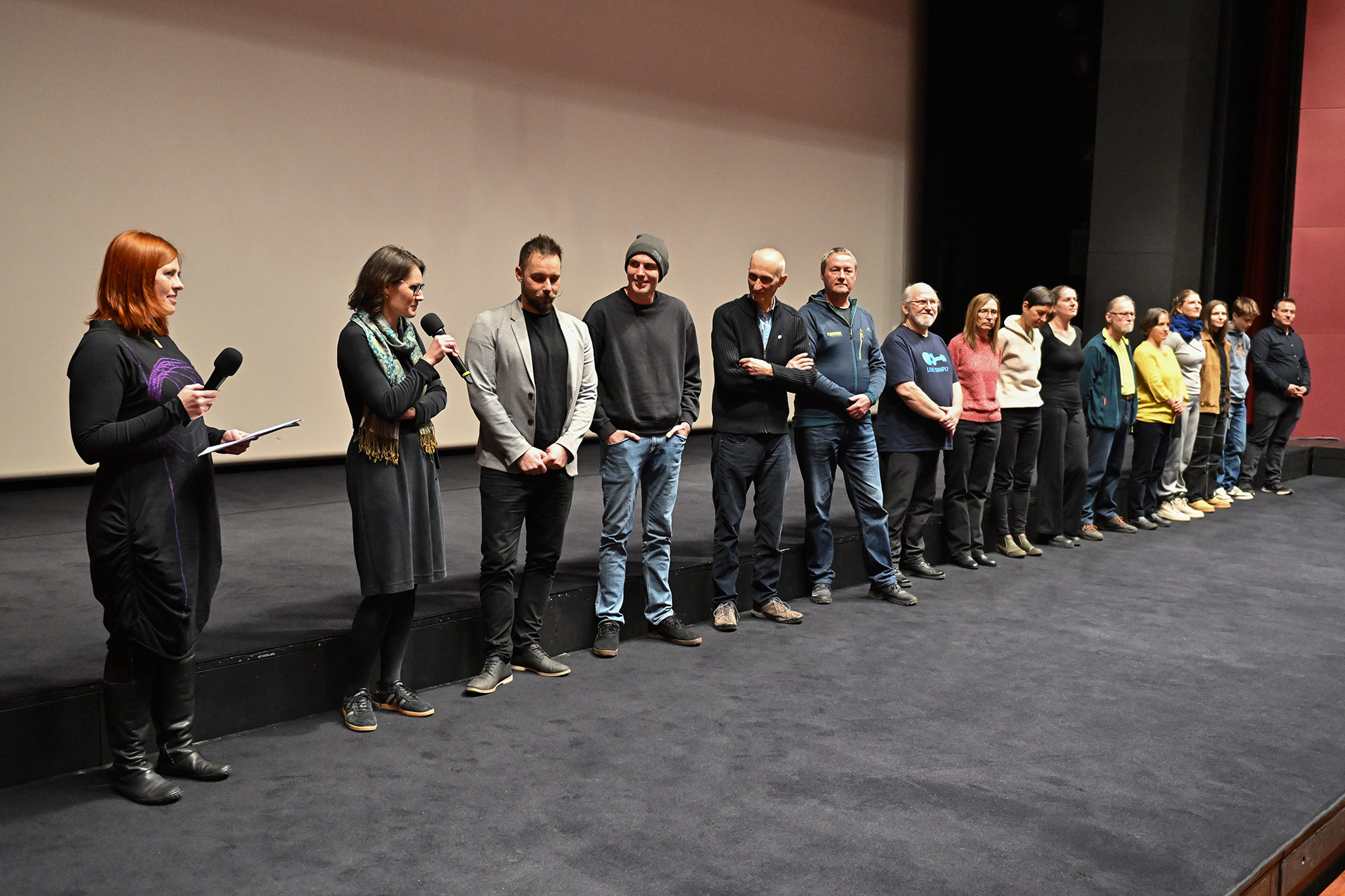 Sorežiserka Mojca Volkar Trobevšek, tudi scenaristka, producentka in organizatorka snemanja, je povedala, kakšen izziv je bilo usklajevati vse te vloge v času nastajanja filma, in da se ji je od srca odvalila triglavska skala, zdaj ko je film na svetlem, in to pred tako številnim občinstvom - hkrati pa se je zahvalila celotni srčni ekipi, kjer je prav vsak prispeval košček v končni filmski mozaik. Režijo sta si delila z Andrejem Podbevškom, ki je pojasnil, kako jim je iz filma, ki bi lahko bil precej dolgočasen dokumentarec, uspelo ustvariti zelo dinamično pripoved in kako so podobo revije prezrcalili v film. Skupaj s snemalcem in direktorjem fotografije Mitjo Legatom sta se Volkar Trobevšek zahvalila s posebnim spominskim darilom - uokvirjenim ozalidom Planinskega vestnika. Gledalcem so se predstavili tudi avtor čudovite filmske glasbe Simon Skalar, avtorica izvirnih animacij Ana Lucija Čuk in asistent na terenu Tine Trobevšek.