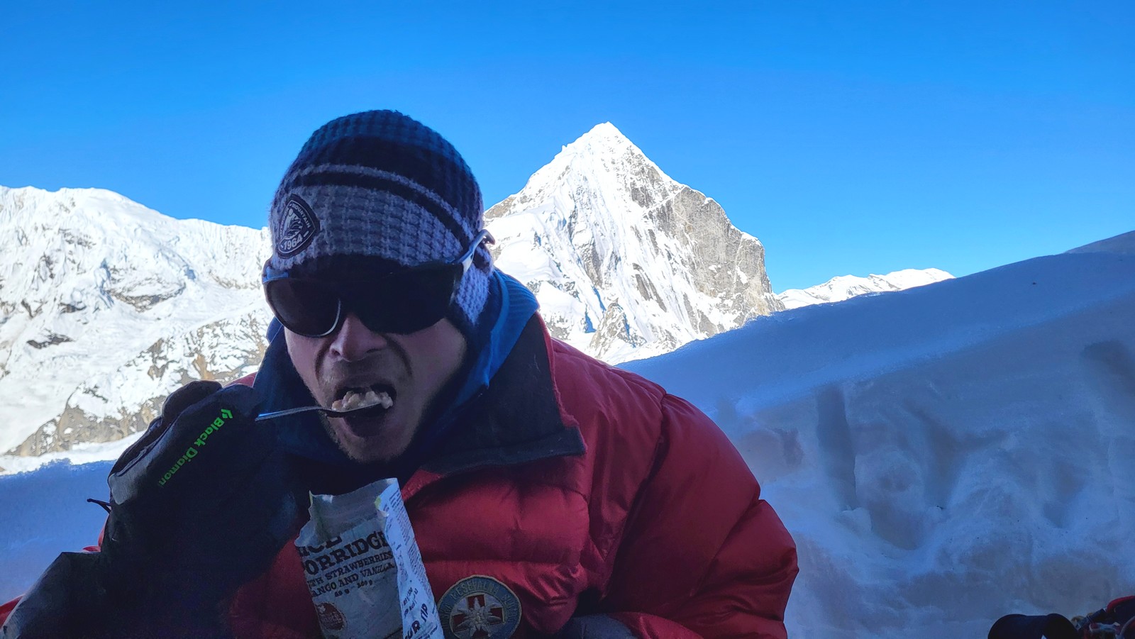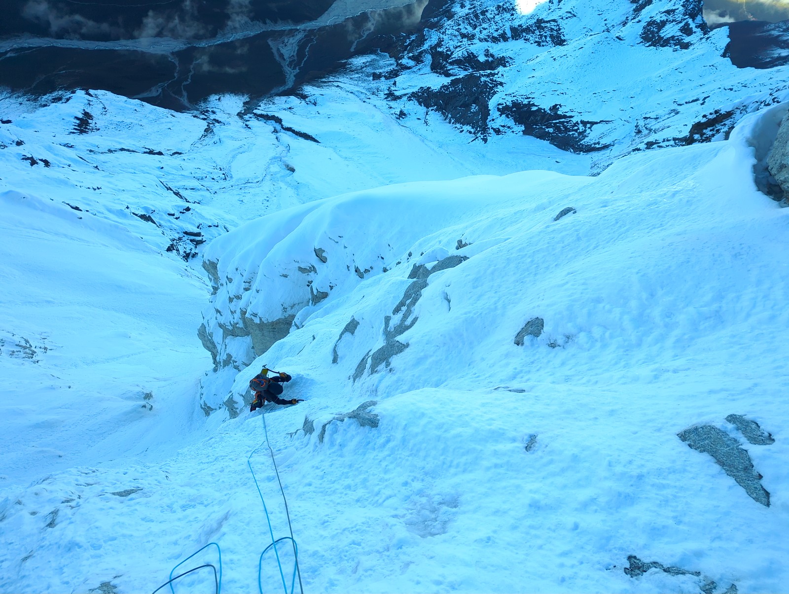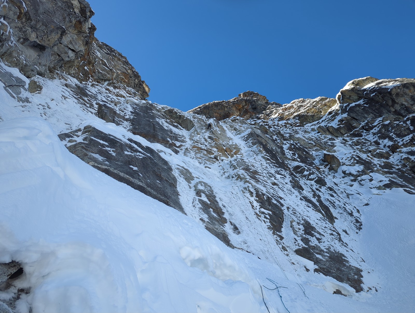 Naslednji dan sva se le stežka aktiviral. Kvaliteta snega se je z višino slabšala. Vse več je bilo strmega terena in nesprijetega snega, ki sem ga počasi odkopaval, da sem dosegel podrto skalo pod njim. Zajeda, ki sva ji sledila, je v sredini široka dobrih 50 m. Sprva sva se držala njenega levega roba, v grabnu je bilo vse manj snega. Po dveh raztežajih napornega kombiniranega plezanja (M5, M6+) sem se težavam skušal ogniti po delikatnem sistemu polic z naloženim snegom na desni. Napredovala sva počasi – stojišča si je bilo treba izkopati v globokem pršiču. V retrospektivi … mogoče bi napredovala hitreje, če bi se ves čas držala leve. Okoli treh naju prehodi, ki sva jih označila za najbolj naravne, pripeljejo do pokončnih gladkih plat, prekritih s tankim ledom, ki je odpadel že ob najmanjši obremenitvi. V iskanju alternativnega obhoda sem najprej poizkusil v suhem previsnem kaminu, a sem v četrt ure uspel napredovati za le dva metra. Medtem ko molče razmišljava o begu, opaziva vzporeden sistem skalnatih polic, katerega sva dosegla po desetmetrskem suhem odseku majavih lusk. Polica se po dveh raztežajih skalnega sveta (V+/V) zapre slabih 100 metrov pred vrhom. S spustom po vrvi in nihajno prečko sva se spustila nazaj v zajedo, kjer naju je ujela noč. Do vrha stene naju je ločil še poln raztežaj strmih plat, prekritih z metrom svežega nesprijetega snega. Napredovala sva počasi. S cepinom sem sistematično odkopaval sneg, iskal razčlembe v skali in se z nogami poizkušal obdržati na krhkih kupih pršiča. Vrh stene, na višini približno 5850 m sva dosegla ob devetih zvečer in bivakirala pod skalnim previsom.