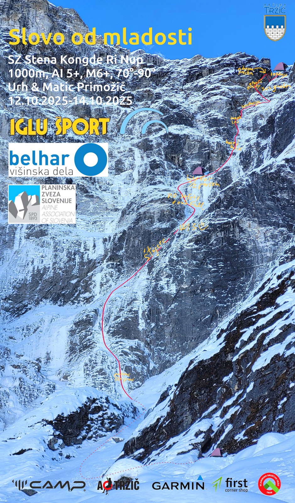 Cilj odprave je bilo preplezati prvenstveno smer v dolini Thame. Sprva sva načrtovala linijo v severozahodni steni gore Tengkangpoche (6487 m), po obilnih padavinah pa sva se usmerila v severozahodno steno Kongde Ri Nup (6035 m), kjer nama je v povprečnih razmerah uspelo preplezati novo smer Slovo od mladosti (AI 5+, WI3, M6+,A1, do 90 °, 1000 m). Celotno smer sem v vodstvu preplezal Urh.