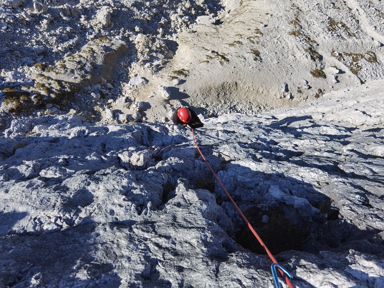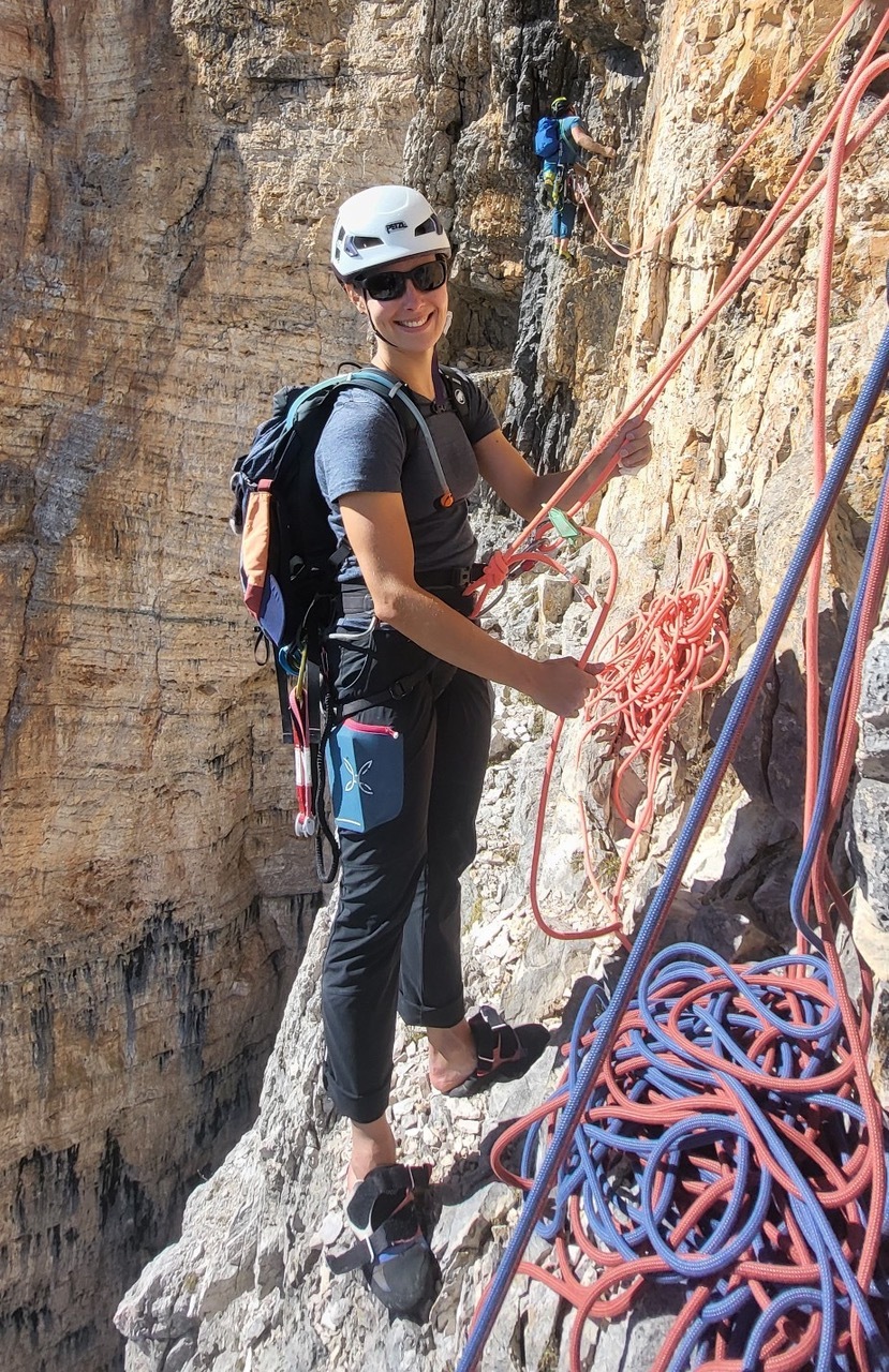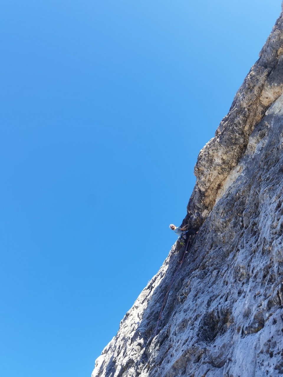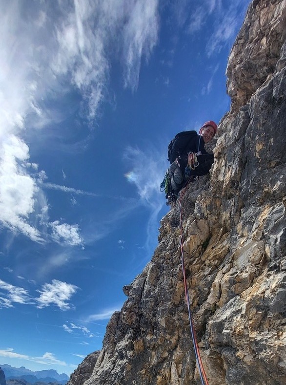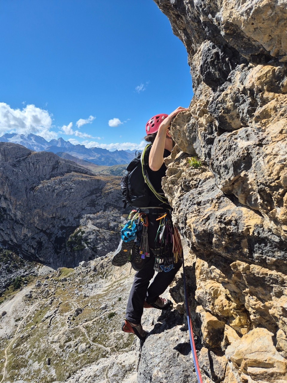 - Ajda Vodnjov: Tabor Dolomiti 2025 nas je razvajal z več kot popolnim vremenom, čudovitimi smermi in neprecenljivo družbo. Moj namen je bil, da čim več plezam naprej – in res sem vsak dan dobila priložnost, da sem segla čez svoje meje. Prvi dan sva z Vido dobili Boruta, ki je s svojo mirnostjo in nalezljivo pozitivnostjo poskrbel, da sem brez treme vlekla raztežaje naprej. Klin, ki sem ga zabila tako, da ga niti on ni mogel izbiti, bo ostal mali spomenik prvega dne – Michela pa je dobila novi klin. Drugi dan je bil v znamenju Mateja – tam ni bilo prostora za hec. Sama sem potegnila Spigollo Alpini, Matej pa je komentiral vsako sidrišče, preverjal in poslikal vse metulje in me usmerjal v težje variante. Rezultat je bila tura, ki je bila hkrati najbolj poučna in najbolj »za ego boleča«. A ravno takšne ture prinesejo največjo rast. Zadnji dan sem bila v navezi z Andrejem, ki je s svojo mirnostjo in preudarnostjo poskrbel za idealen zaključek. Via del Buco Bassa Variant sva splezala hitro, izmenično in ob tem še vedno skrbno vadila nameščanje varovanja. Inštruktorji so bili neverjetno prilagodljivi – poslušali so naše želje in strahove, nas spodbujali, usmerjali, nam vlivali zaupanje ter delili neprecenljive napotke. V treh dneh so nam predali neopisljivo količino znanja in izkušenj, kar je resnično izjemno. Iskreno hvala vsakemu posebej in celotni ekipi skupaj – za potrpežljivost, znanje, humor in podporo, s katero so iz tabora naredili popoln vikend v skali. Ogromna zahvala tudi KA PZS za organizacijo in izvedbo – takšni dogodki so prava življenjska popotnica!